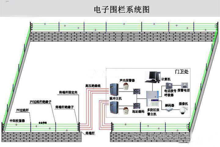 电子围栏是目前先进的周界防盗报警系统,它由电子围栏主机和前端探测围栏组成。电子围栏主机是产生和接收高压脉冲信号,并在前端探测围栏处于触网、短路、断路状态时能产生报警信号,并把入侵信号发送到安全报警中心;前端探测围栏由杆及金属导线等构件组成的有形周界。通过控制键盘或控制软件,可实现多级联网。电子围栏是一种主动入侵防越围栏,对入侵企图做出反击,击退入侵者,延迟入侵时间,并且不威胁人的性命,并把入侵信号 发送到安全部门监控设备上,以保证管理人员及进了解情况.电子围栏的阻挡作用首先体现在威慑功能上,金属线上悬挂警示牌,一看到便产生心理压力,且触碰围栏时会有触电的感觉,足以令入侵者望而却步;其次电子围栏本身又是有形的屏障,安装适当的高度和角度,很难攀越;如果强行突破,主机会发出报警信号。